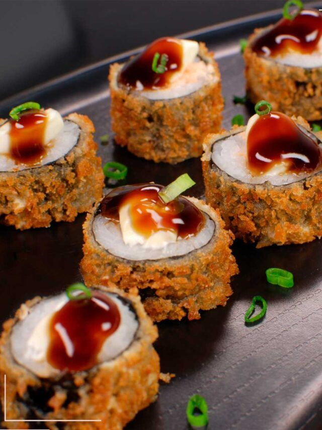 Alga por fora, arroz, recheio, cream cheese e frito com farinha panko.
