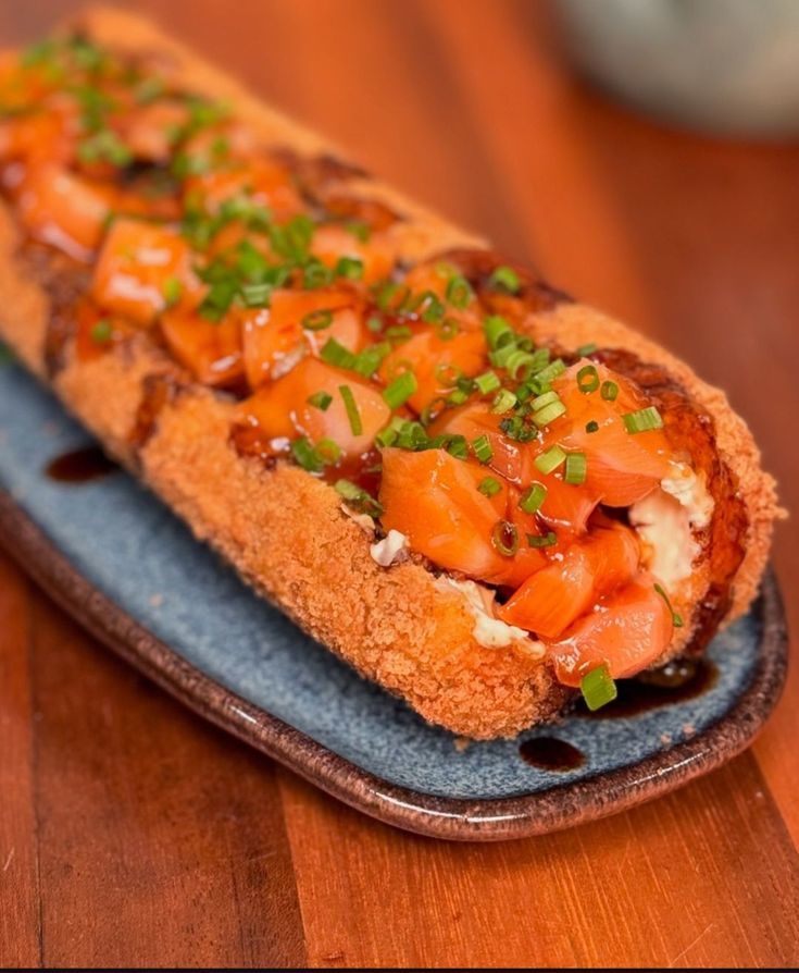 Alga por fora, arroz, recheio, cream cheese e frito com farinha panko.